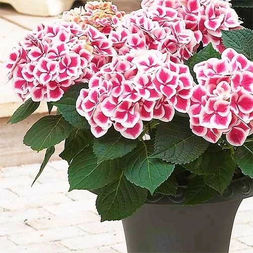 Гортензії Camilla (Каміла) цвіте з липня по жовтень великими суцвіттями. Квітки простої форми з ефектною забарвленням: рожево-червоні з білою облямівкою по краю. При підвищеній кислотності забарвлення змінюється на насичено фіолетове.