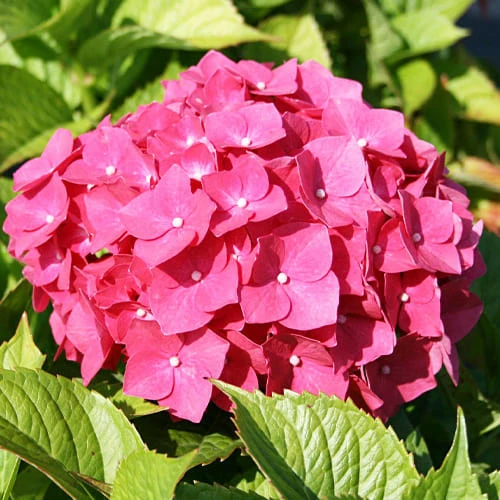Чагарник Гортензія Leuchtfeuer з оксамитовим темно-зеленим листям і великими квітковими головками, розпускання яких відбувається в кінці літа. Квітки в центрі фіолетові, їх оточують блідо-рожеві зовнішні.При хорошому догляді досягає 4 м у висоту.