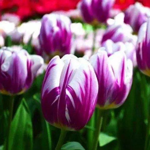 Тюльпан Flaming Flag (Tulipa Triumph 'Flaming Flag'). Це середньоквітний сорт, який належить до класу Тюльпани Тріумф. На нашому ринку він з'явився зовсім недавно, 2007 року. Виробник: Y.C.de Jong. Ніжний, спокусливий тюльпан! Має дивовижні білі квіти з невеликими бузковими смугами, штрихами та домішками по центру пелюсток. Денце келиха світло-лимонного кольору. Квітка велика, класичної келихової форми. Розмір келиха: висота приблизно 7 см, а діаметр — приблизно 5 см. Має приємний аромат. Квітоноси потужні, досягають висоти 45-50 см. Весняна негода не може зіпсувати його елегантну форму або іскрувати квітково. Тривалість його цвітіння — 8-10 днів (залежно від погодних умов). Цей тюльпан ефективний у контейнерах або у великих групах у квітниках і бордюрах. Добре росте як на освітленому місці, так і в напівтіні. Ідеально підходить для зрізання найвищої якості, причому не тільки у відкритому ґрунті, але й у виганці (в середні та пізні терміни). Колірає наприкінці квітня — на початку травня.