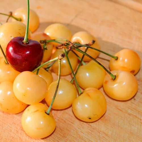- Жёлтая вишня – это редкий, необычный вишнёво-черешневый гибрид (дюк). Получен при скрещивании обычной вишни и жёлтой черешни. Кожица плода непривычного для вишни, жёлтого цвета. Мякоть нежная, как у вишни, вкус довольно интересный, кислота вишни, а сладость черешни. Созревание с 10-го по 15-е июня. Лист по форме как у черешни, но более заокругленный. Дерево по структуре напоминает черешню.